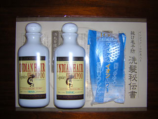 インディアン伝承シャンプー2本、限定全員プレゼントのマイナスイオンブラシ、および、限定ネット購入プレゼントの洗髪秘伝書です。
